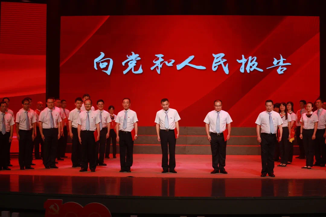晚会在《向党和人民报告》中进入高潮,集团党委书记、董事长周俭,集团党委副书记、副董事长、总经理朱志康分别为荣获2020年集团先进基层党组织、优秀党务工作者和优秀共产党员代表颁奖;现场,全体新党员和老党员在周俭董事长带领下庄严宣誓,表达了身为新时代共产党员的责任与担当;集团下属5家公司主要负责人向全体人员现场报告本公司“十四五”时期目标,表达了对党、对政府、对人民的承诺。