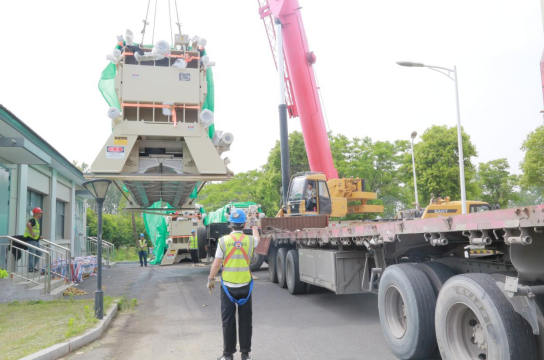 面对工期紧张、作业空间受限等挑战,滨海供水公司成立专班工作组,联合设备供应商,通过提升专家论证层级、邀请区级大型建筑行业专家优化吊装方案、并开展多轮现场踏勘,最终确定创新采用400吨级重型吊机,吊装高度达21米。作业现场,施工团队精准测算设备进场路径及吊臂旋转半径,实现单台设备2小时快速定位,安全高效完成吊装作业。