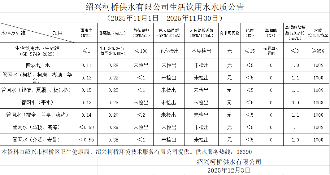MK在线注册水质公告(2025年11月1日—2025年11月30日)