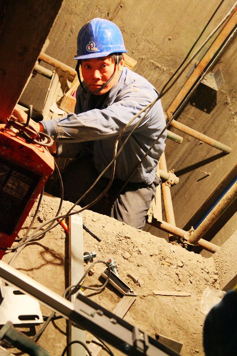 图为施工人员正在安装电梯轨道