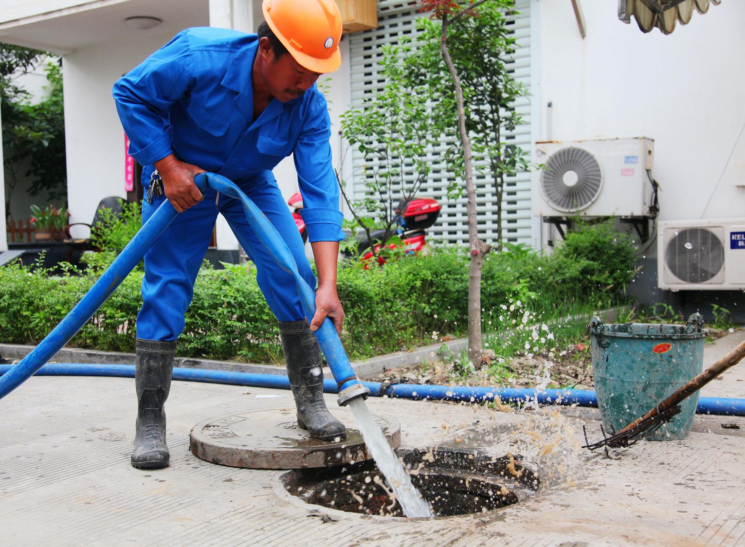 图为施工人员正在对小区内污水管道进行疏通