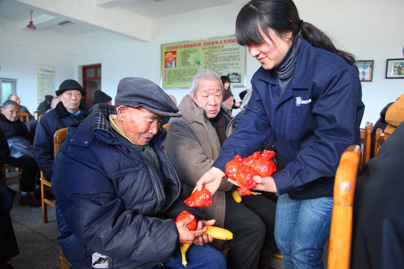 志愿者为夕阳红敬老院老人分发水果、毛巾等物品