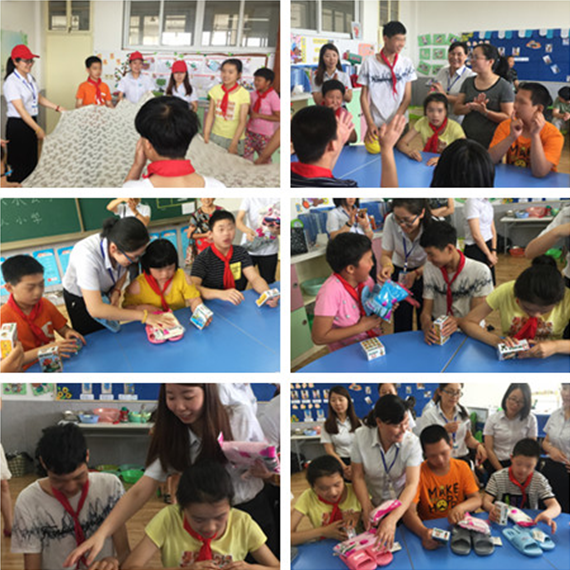 在学校老师的带领下,“爱心妈妈”和党员志愿者们陪伴特殊孩子们一起参与躲鲨鱼、网布传球和击鼓传花等互动游戏,并为孩子们送去了住校用的拖鞋、毛巾等物资,用爱心给孩子们带去欢笑,给予他们温暖与关怀。