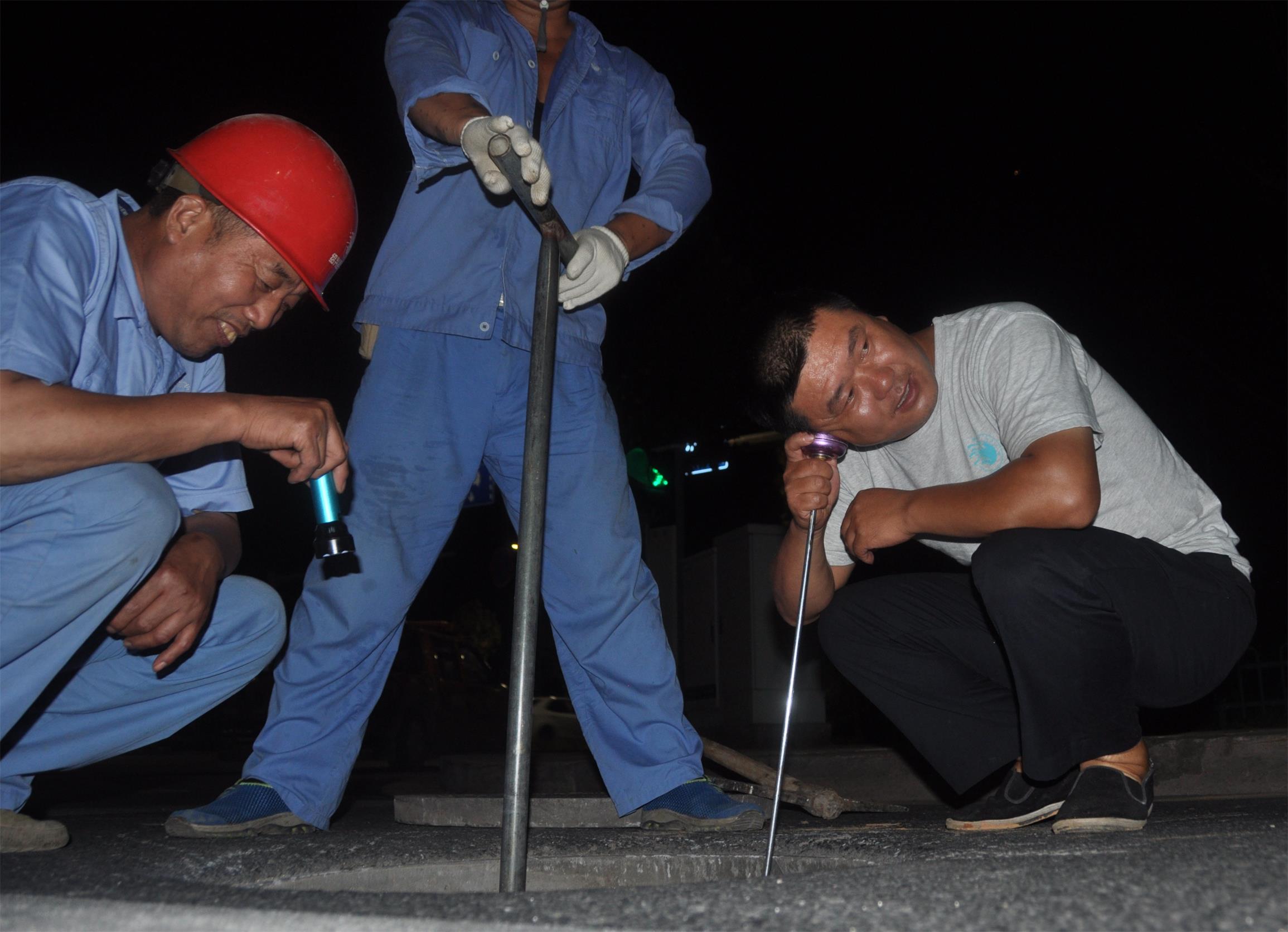 为进一步降低水量漏损,8月8日晚,城区分公司在前期集中“会诊”的基础上,协同管网分公司精干力量组成一支16人组成的“出诊队伍”,对柯岩南片香林大道、高尔夫路、柯岩大道和南闲路四条总管进行了夜间集中听漏。听诊人员穿梭在夜深人静的马路上,用耳、用心感受“地下网”的疑难杂症,发现可疑漏点随即记录笔记,并在隐患处做上标记,没有言语交流,却彼此配合默契。次日把“诊断报告”带回,进行集中“会诊”后再“对症下药”。
