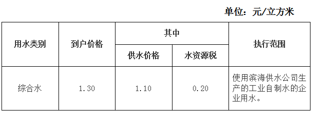 滨海工业区综合水水价收费标准